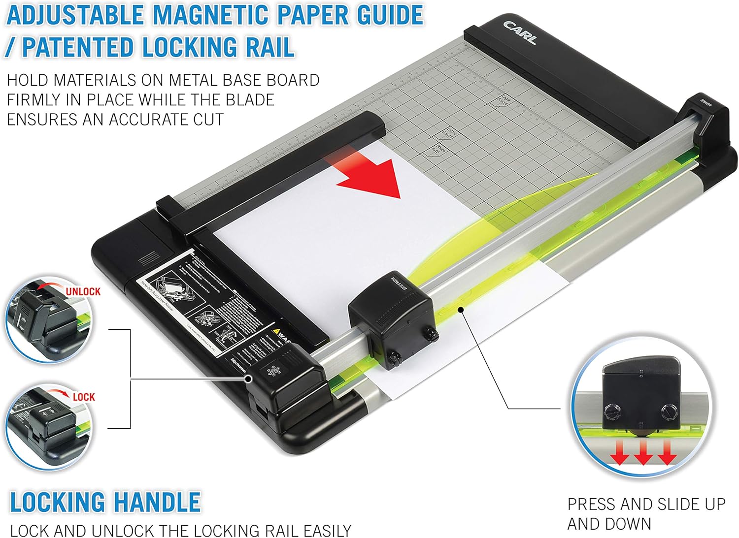 • Paper trimmer size: 3.5"H x 15.75"W x 23.5"D. Comes in black for attractive look. Lifetime manufacturer limited warranty.