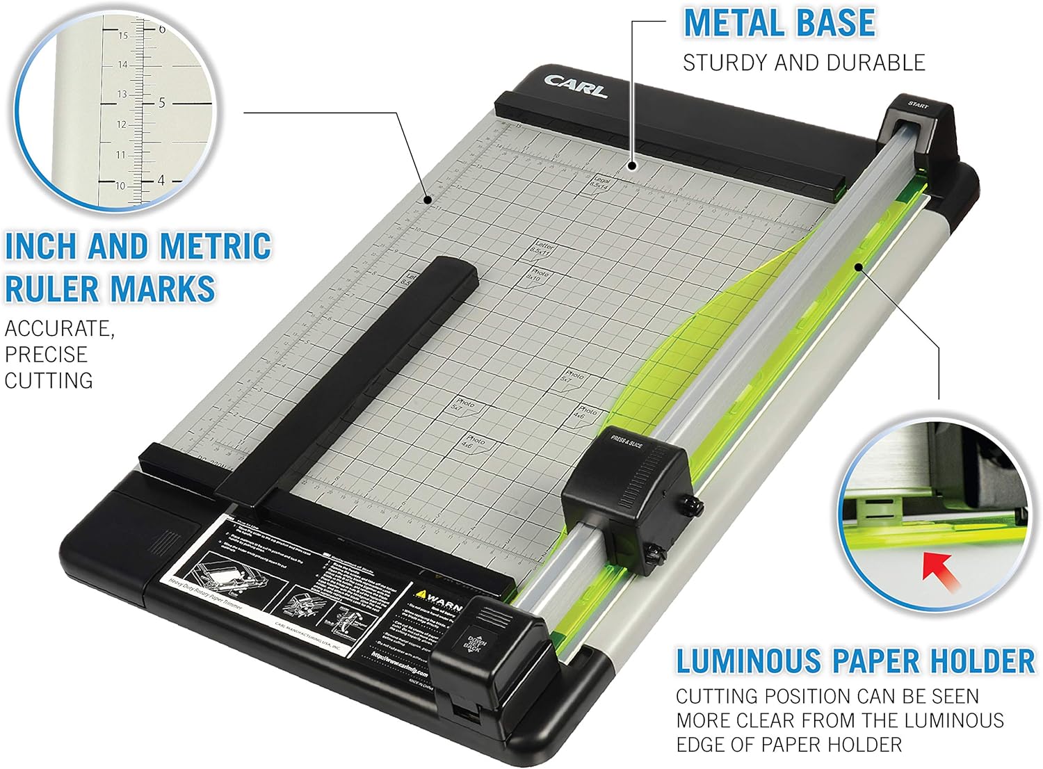 • All paper crafting enthusiasts know that a rotary trimmer is a must-have. Locking rail mechanism, luminous paper holder, adjustable magnetic paper guide, storage compartment for extra blades and mats. Made from recycled materials.