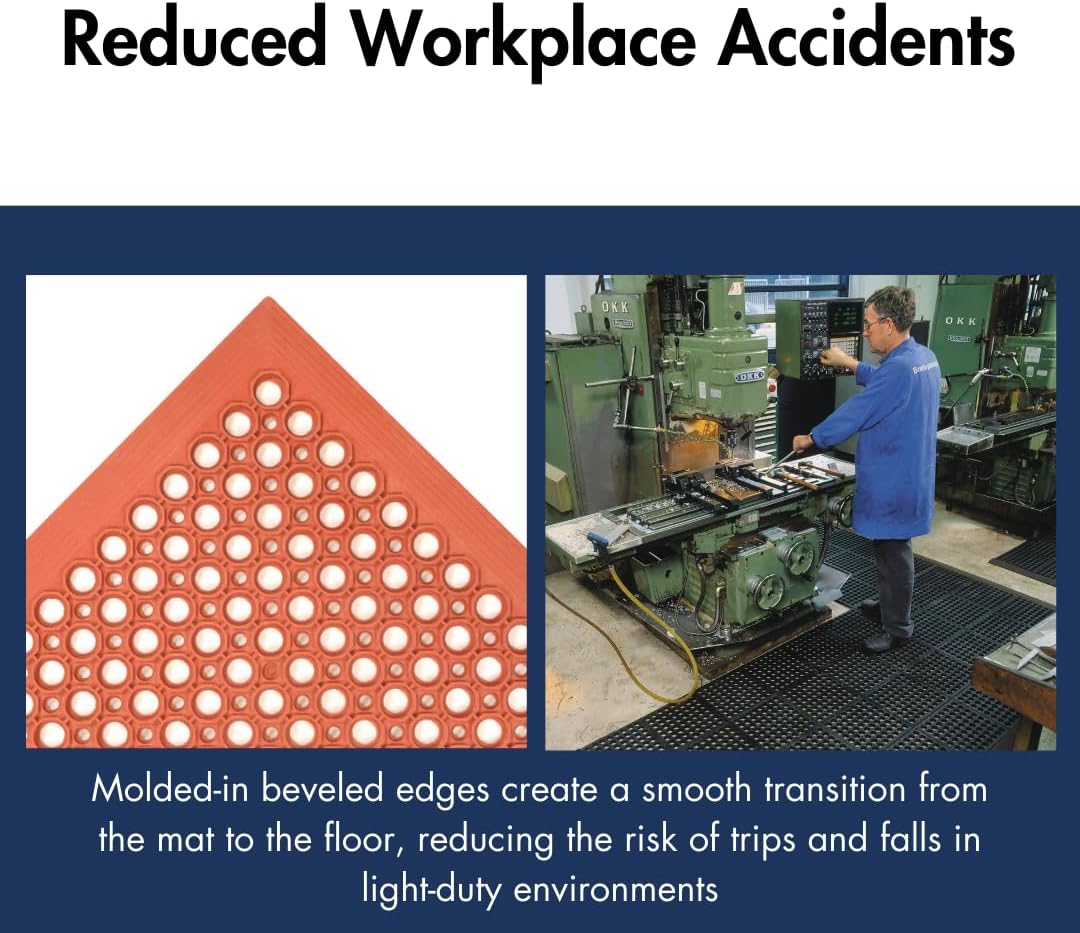 • Increased Workplace Safety - Our anti-fatigue rubber matting with molded-in beveled edges provides a smooth transition from the mat to the floor, ideal for use as commercial kitchen mats