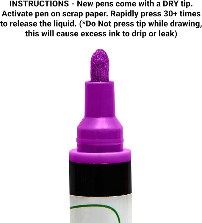 • INSTRUCTIONS TO START- Activate new pen on a scrap piece of paper. Gently press 20-30 times to release the liquid inside. (Do Not pump tip while writing, this will cause excess ink to drip or leak.)
