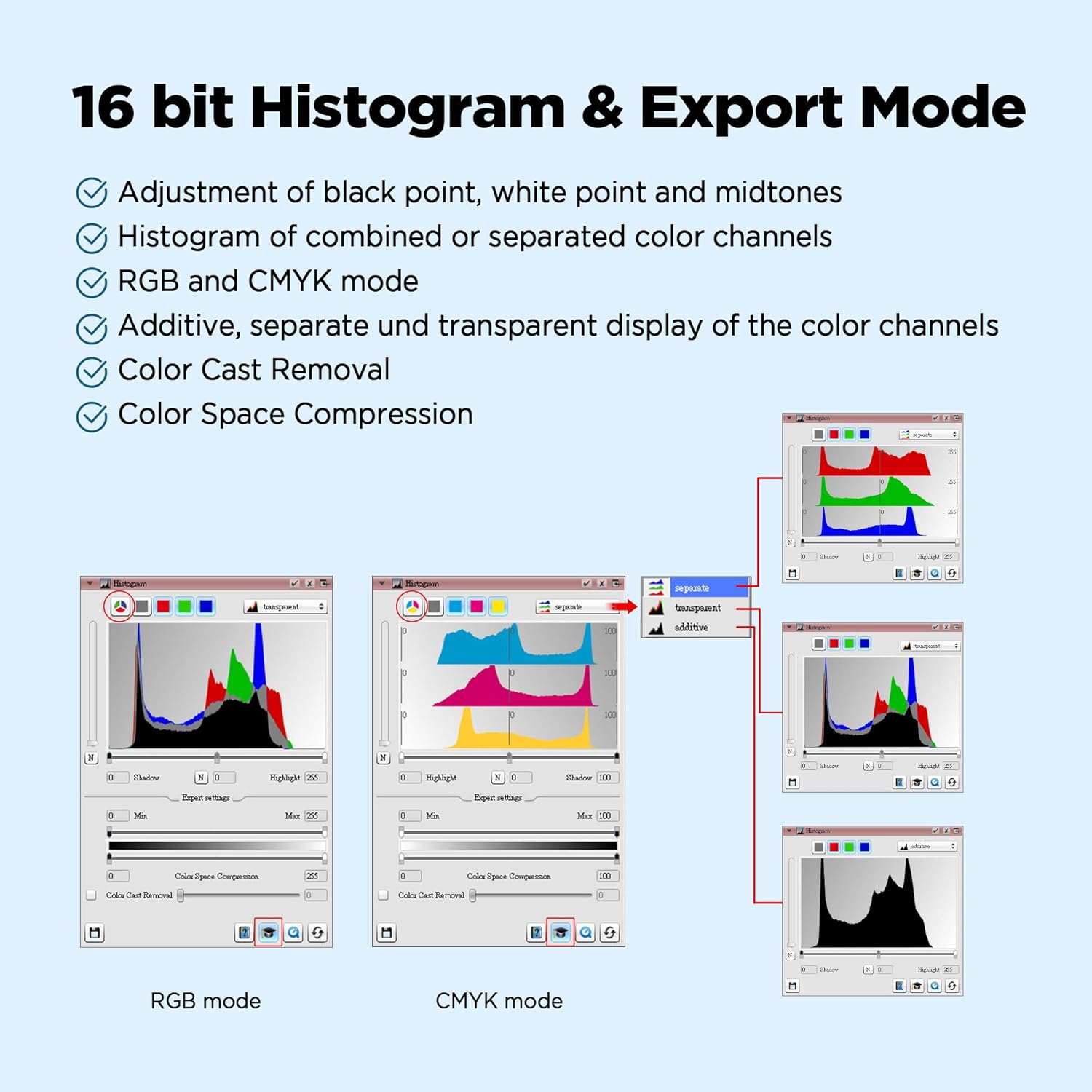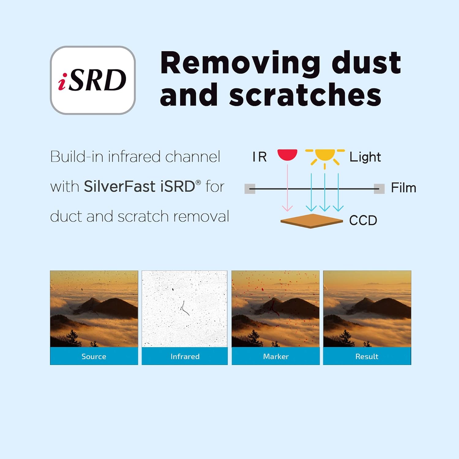 • Built-in infrared channel can detect dust and scratches on the surface of the original negatives and slides. It is highly useful for defect removal without retouching the images. (PS: The scanner's infrared rays cannot permeate through the silver halide layer, so it not works for B/W negatives scanning.)
