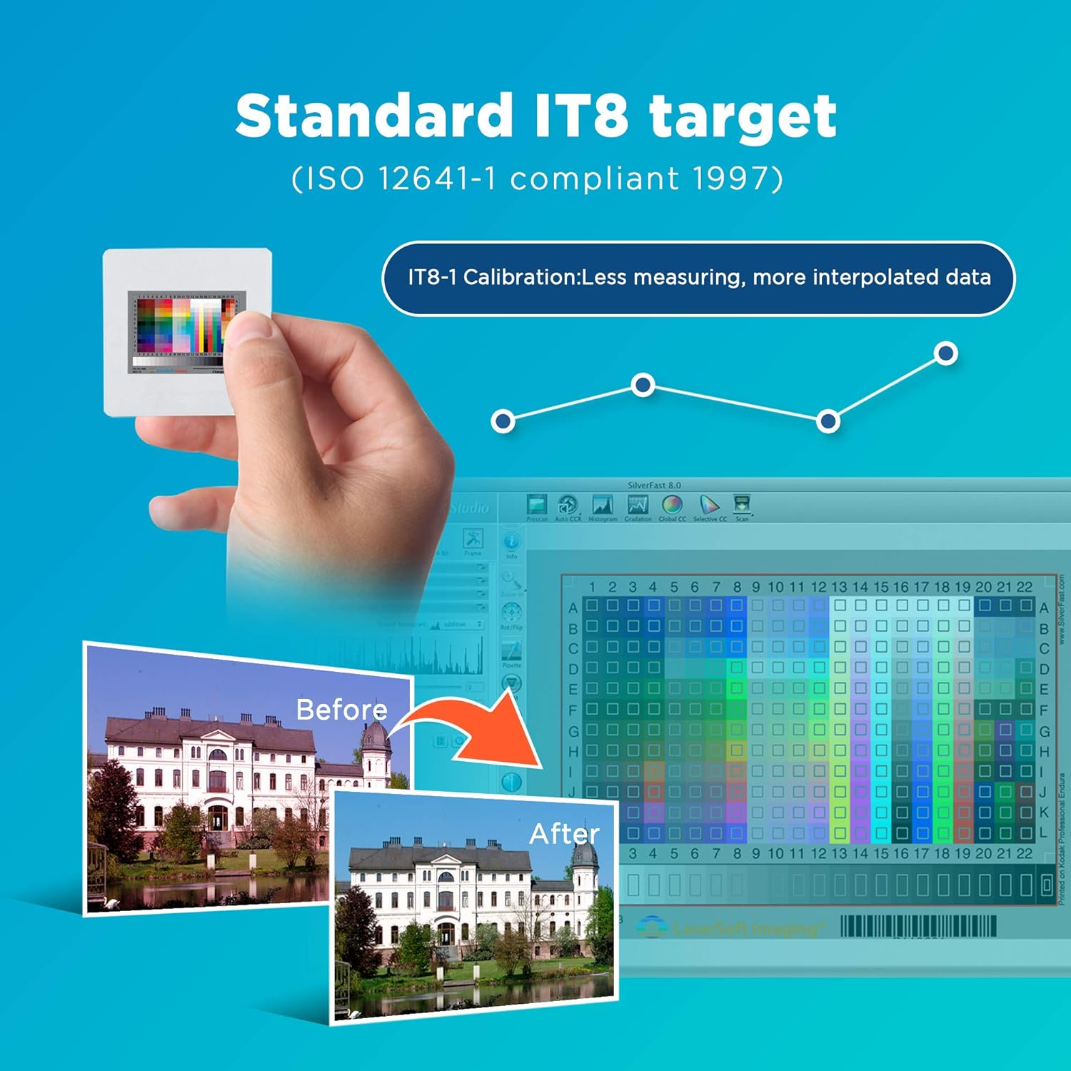 • Standard IT8 Calibration Target (ISO 12641-1 compliant 1997) helps you ensures accurate color results , reducing the need for repeated scans or extensive post processing color correction