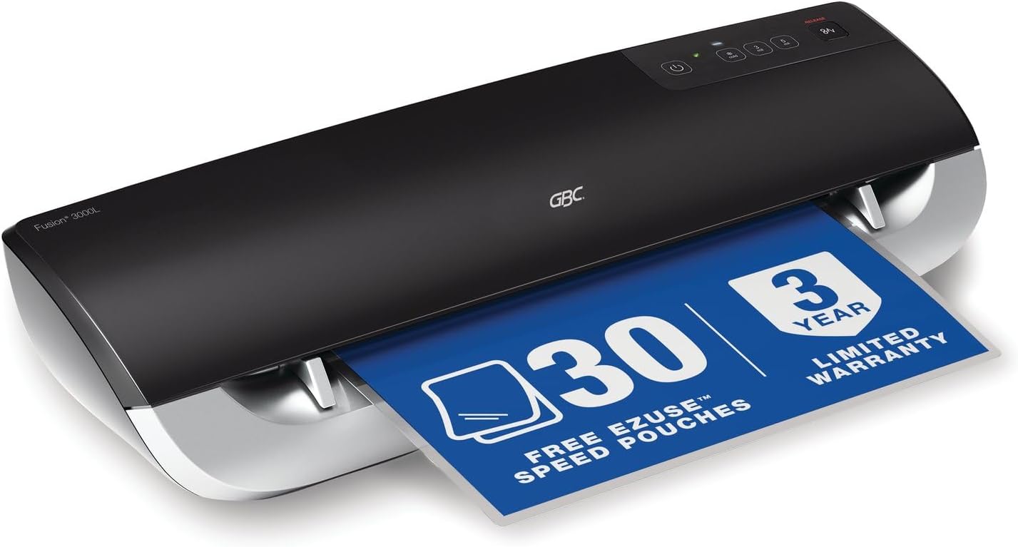GBC Thermal Laminator Machine, Fusion 3000L, 12 Inch, 1 Min Warm-up, 3 or 5 Mil, with 30 EZUse Laminating Pouches (1703075)