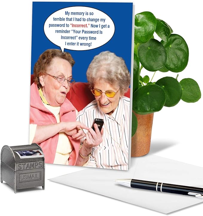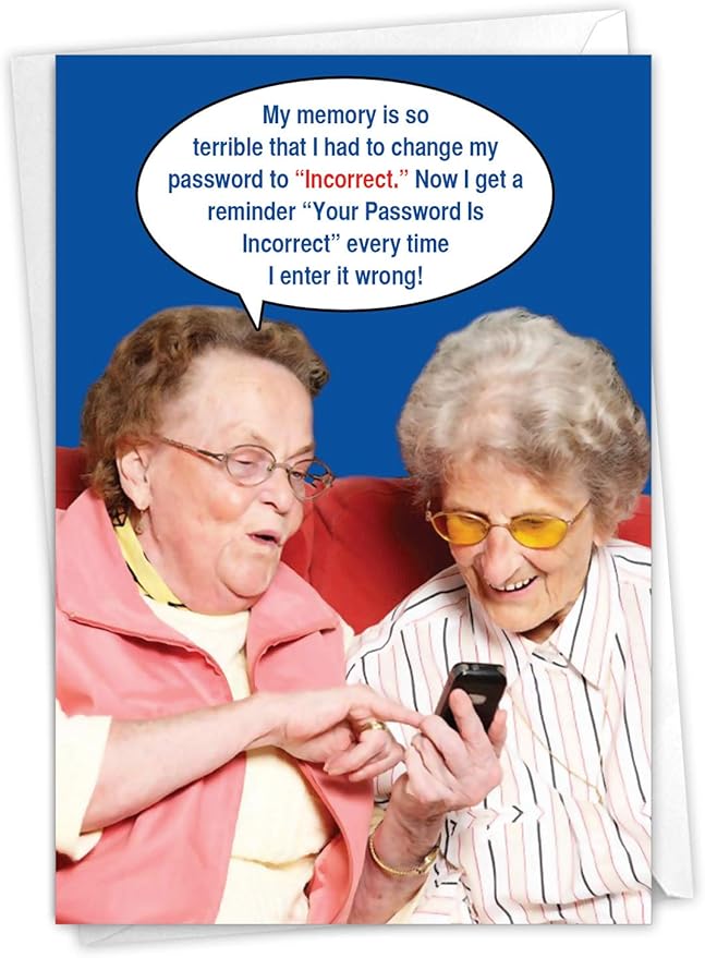 • INSIDE GREETING: "To Continue Enter The Correct 2 Digit Age And Press [Happy Birthday]" COVER - My memory is so terrible that I had to change my password to "Incorrect." Now, I get a reminder "Your Password Is Incorrect" every time I enter it wrong!