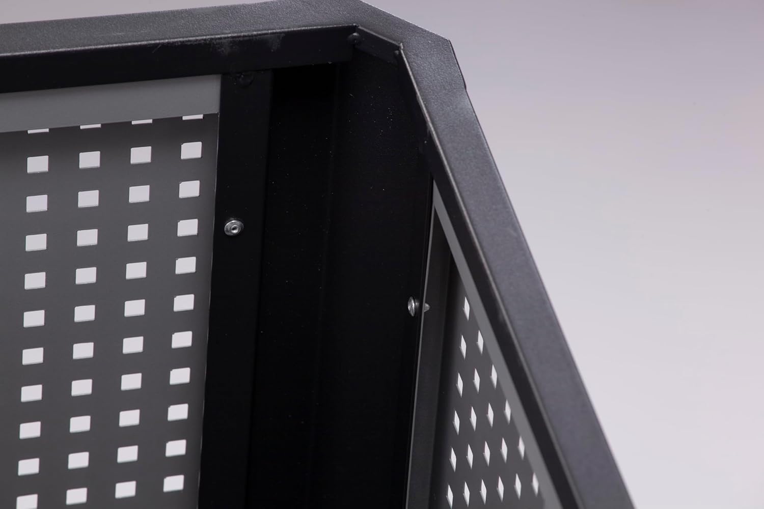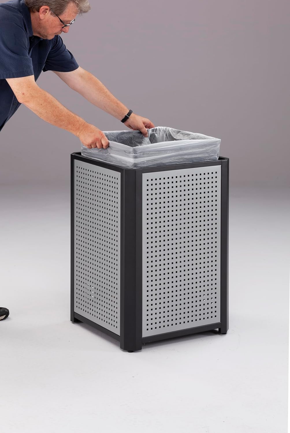 • MODERN STYLING. Evos Outdoor and Indoor Steel Trash Can features four stylish perforated panels on a heavy-duty steel frame with galvanized base to resist rust and corrosion while keeping high traffic areas clean and litter free.