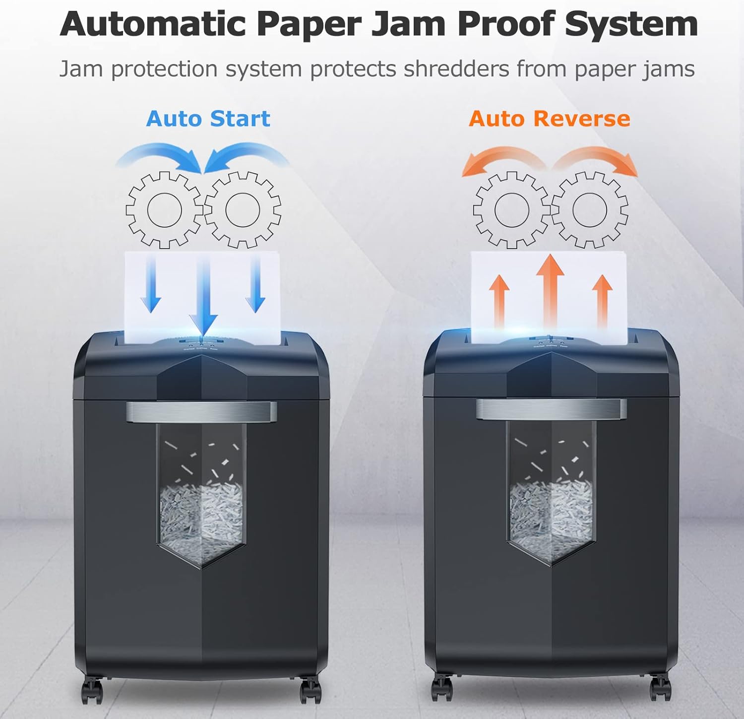 • Auto Start & Reverse: Auto start/stop and auto-reverse function protect you from the frustration of paper jams; overheating and overloading protection technology keeps sustainable using and prolong shredder's use time. Press the power switch, you only need to put the paper into the entrance of the shredders for home office and it will work automatically
