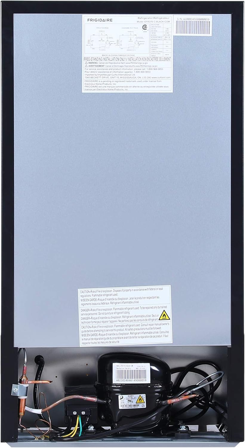 • Fridge dimensions: 17-1/2” W x 18.5/8” D x 31.5/8” H | 84 L - 3.2 cu. Ft. inner space | Product weight: 50.7 lbs. | Freezer capacity: 0.2 cu. Ft. | Refrigerant type: R134a, 1.77 Oz/50g