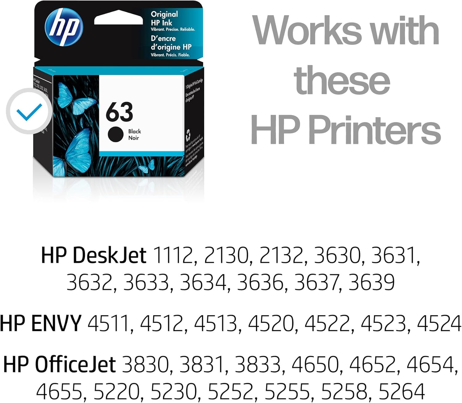 • This cartridge works with: HP DeskJet 1112, 2130, 2132, 3630, 3631, 3632, 3633, 3634, 3636, 3637, 3639; HP ENVY 4511, 4512, 4513, 4516, 4520, 4522, 4524; HP OfficeJet 3830, 3831, 3833, 4650, 4652, 4654, 4655, 5212, 5222, 5230, 5232, 5255, 5260, 5264