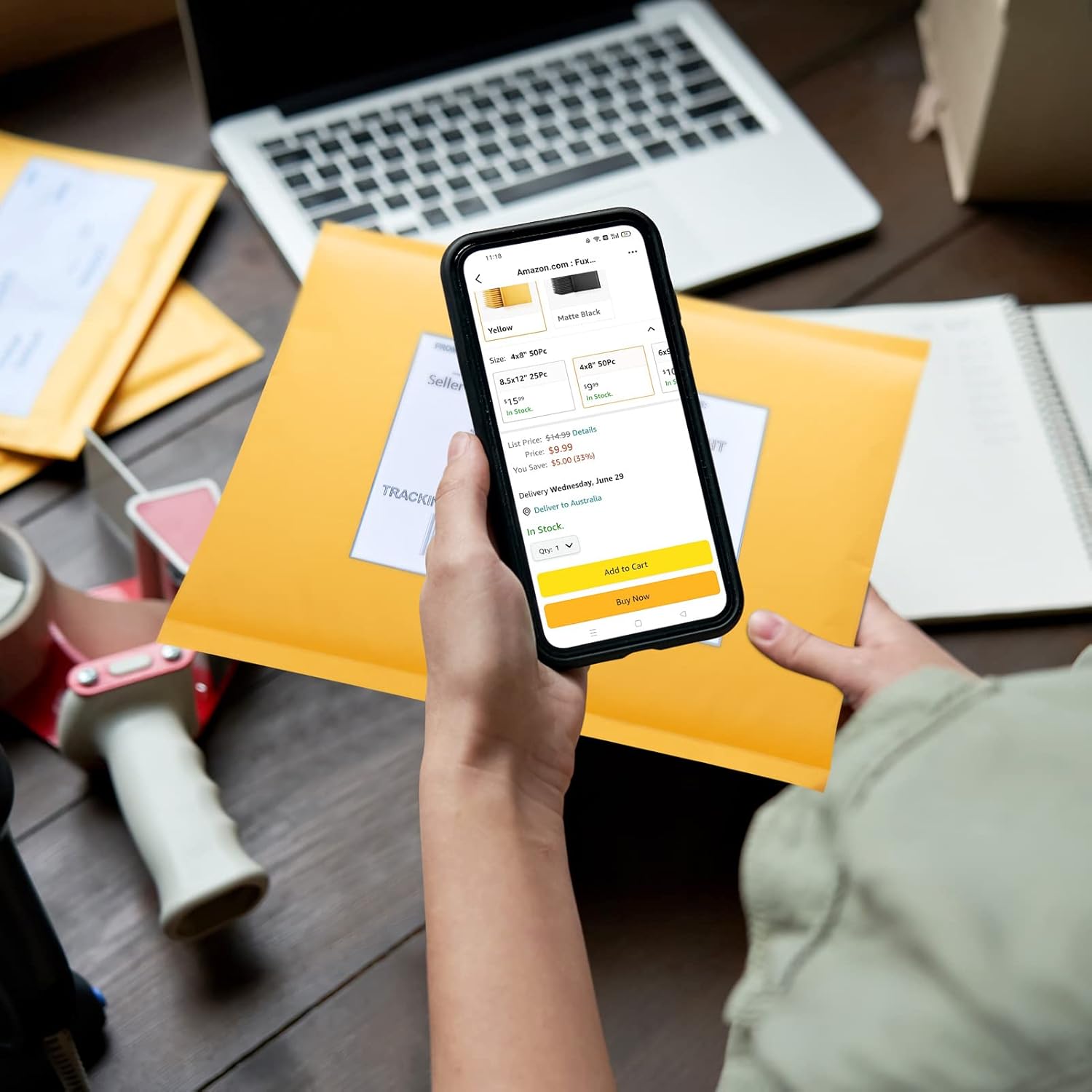 • 【Simple Peel & Seal 】Simply peel and fold over to seal each package safely and securely.Bubble envelopes are equipped with a strong self-sealing adhesive strip that cannot be easily torn apart and tamper-resistant.Moreover,the smooth surface of the yellow Kraft bubble mailers can be written, labelled and stamped.