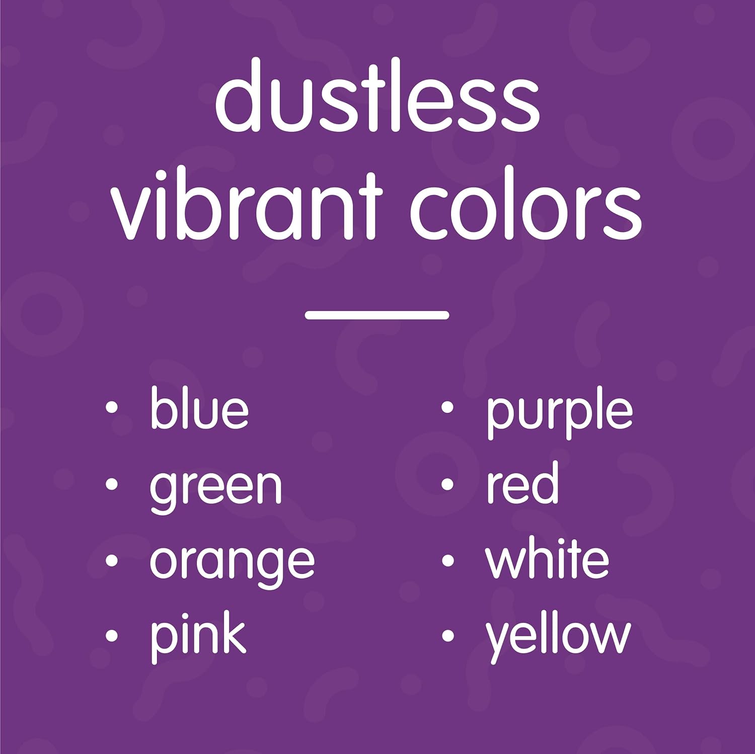 • MULTICOLOR: This multi-pack of dustless chalk comes in 8 vibrant colors, including blue, green, orange, pink, purple, red, white, and yellow chalk.