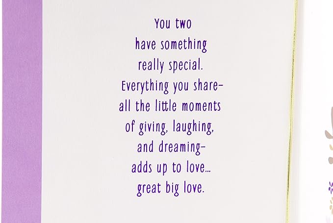 • Inside message: you two have something really special. Everything you share—all the little moments of giving, laughing, and dreaming—adds up to love. . . Great big Love. Today is about celebrating that love, your life together, and the joy within your journey.