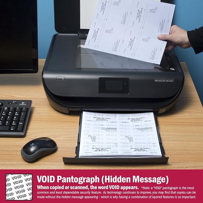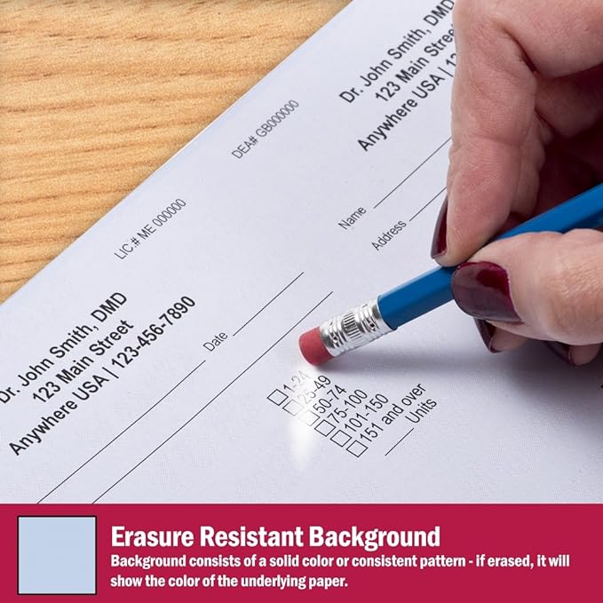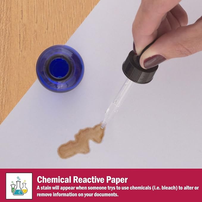 • Security paper features include: acid free; hidden message technology (a “VOID” appears when copied); a blue colored background that shows alterations when erased; chemical reactivity where stains appear when exposed to certain solvents; toner lock coating that bonds printed text to the paper making erasure obvious; and embedded fluorescent fibers which can only be seen when viewed under a blacklight.