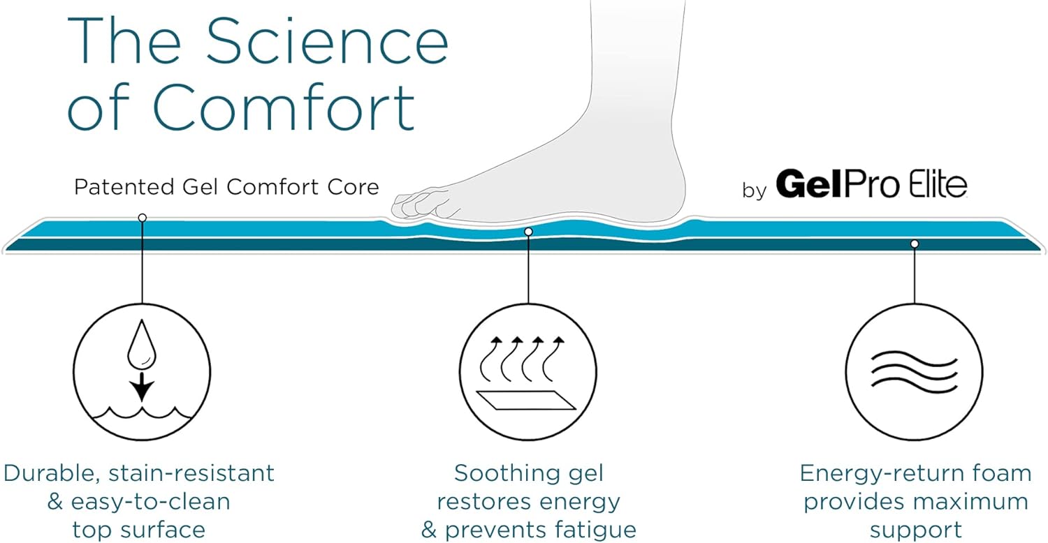 • PATENTED GEL TECHNOLOGY! GelPro Elite features a ¾” core of soothing gel + energy-return foam which dramatically reduces stress, fatigue & discomfort while standing.