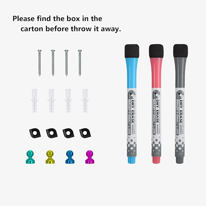 • 【Premium Magnetic White Board】Overall Size (frame included): 47.6" x 34.6", Writing Surface Size: 46.5" x 33.2"; Comes with 3 dry erase markers, 4 magnets, 1 pen holder and fixing kits. Great help for business professional, project manager, clerk, teacher, student and parent etc.