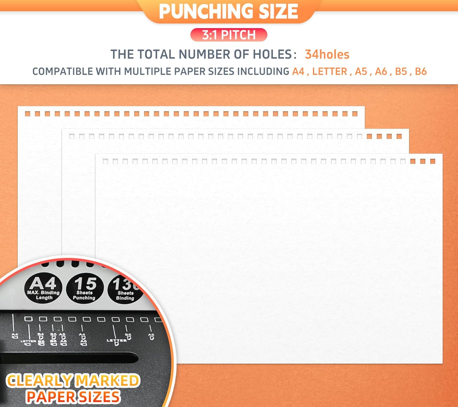 • 【Large Binding Capacity】Capable of binding up to 130 sheets of 80/20lb gsm paper with 5/8inch wire binding spines, this machine can punch through up to 15 sheets of A4 paper in one go. It also handles two sheets of plastic binding covers (0.2mm) or leathergrain binding covers (230gsm) effortlessly.