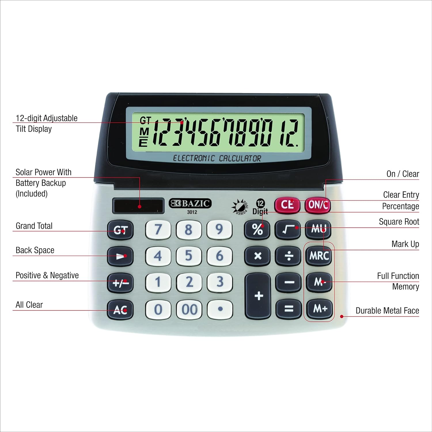 BAZIC 12-Digit Dual Power Desktop Calculator with Adjustable Display (Case of 12) (3012-12)