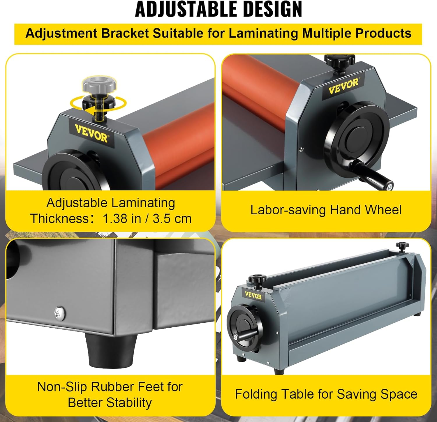 • Adjustable & Folding: Hand crank laminating machine adapts the adjustable roller position, suitable for various material thicknesses; the folding table is convenient for storage and easy to use.