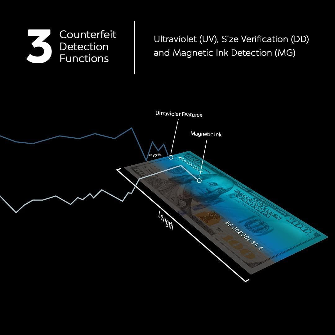 • ULTRAVIOLET + MAGNETIC COUNTERFEIT DETECTION: 3-Point Counterfeit Bills Detector with Visual and audible alerts.