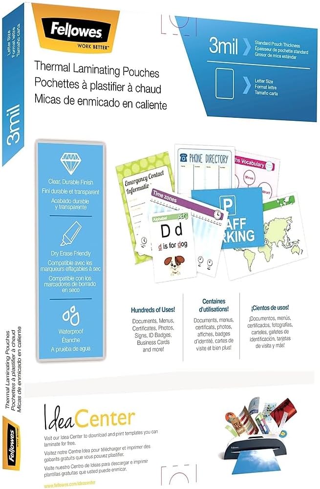 • Give your certificates durable protection with this 100-pack of Fellowes thermal laminating pouches. The waterproof seal safeguards documents from water splashes and wet hands, while the high-quality clear finish boosts visibility and provides a lasting shield. A pack of 100 sheets easily keeps up with your lamination demands. These Fellowes thermal laminating pouches are dry-erase friendly to retain corrections on documents, and the letter-size design is compatible with most thermal laminators.