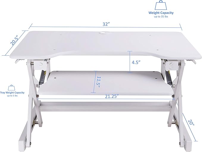 • RETRACTABLE ERGONOMIC KEYBOARD TRAY: 4.5" spacing between keyboard tray and desktop keeps monitor at proper ergonomic height to prevent neck strain while sitting or standing, keyboard tray extends for optimum comfort. Large 21" x 11" keyboard tray size will hold a laptop if needed.