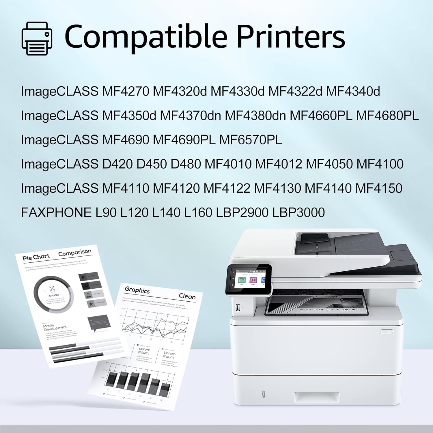 • Compatible for Canon Printer: FAXPHONE L90 / L120 / L140 / L160 / LBP-2900 / LBP-3000, ImageCLASS D420 / D450 / D480 / MF4010 / MF4012 / MF4050, ImageCLASS MF4100 / MF4110 / MF4120 / MF4122 / MF4130 / MF4140 / MF4150 / MF4270 / MF4320d / MF4330d / MF4322d MF4340d / MF4350d / MF4370dn / MF4380dn MF4660PL / MF4680PL / MF4690 / MF4690PL / MF6570PL, LaserJet 1010 / 1012 / 1015 / 1018 / 1020 / 1022 / 1022N / 1022NW / 3015 / 3020 / 3030 / 3050/ 3050Z / 3052 / 3055 /M1319F MFP / M1005F MFP Printers.