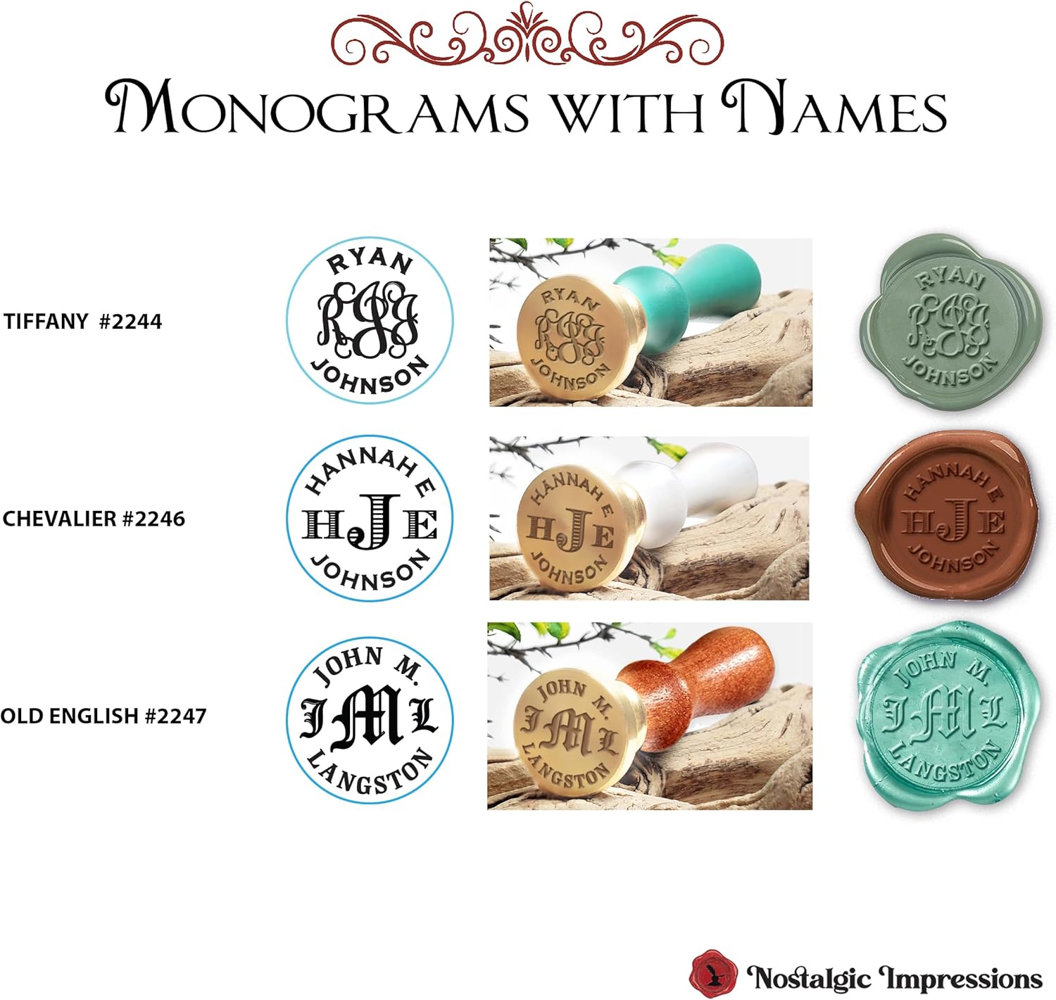 • Custom Monogram Engraving: Your Custom Wax Stamp features your Monogram, and name. Maximum of 14 letters top and bottom, and 3 letter monogram. CLICK CUSTOMIZE NOW BUTTON to create your own layout. Engraved in the USA with State of the Art Laser Engraving offering deep rich details that leaves a clean and concise imprint in wax. Can be used with any sealing wax.