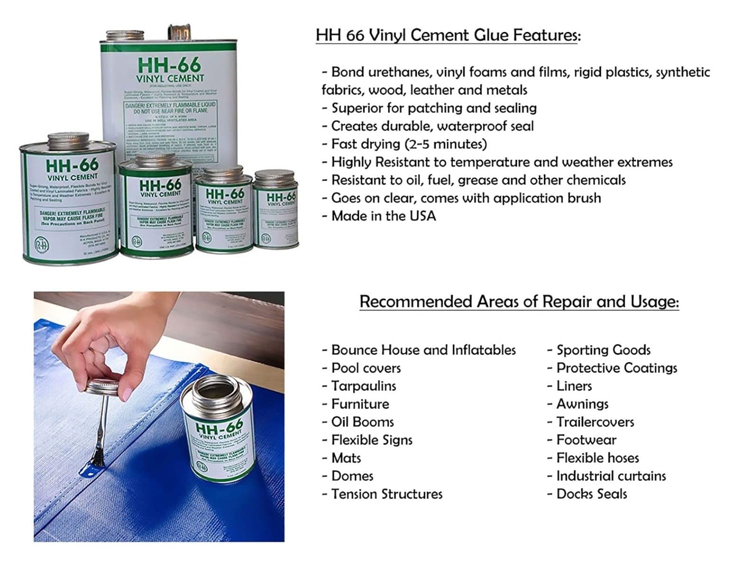 • INCLUDES - Storage Container, 9 Patches, 4-ounce HH66 Vinyl Adhesive, Steinel Silicone Seam Roller