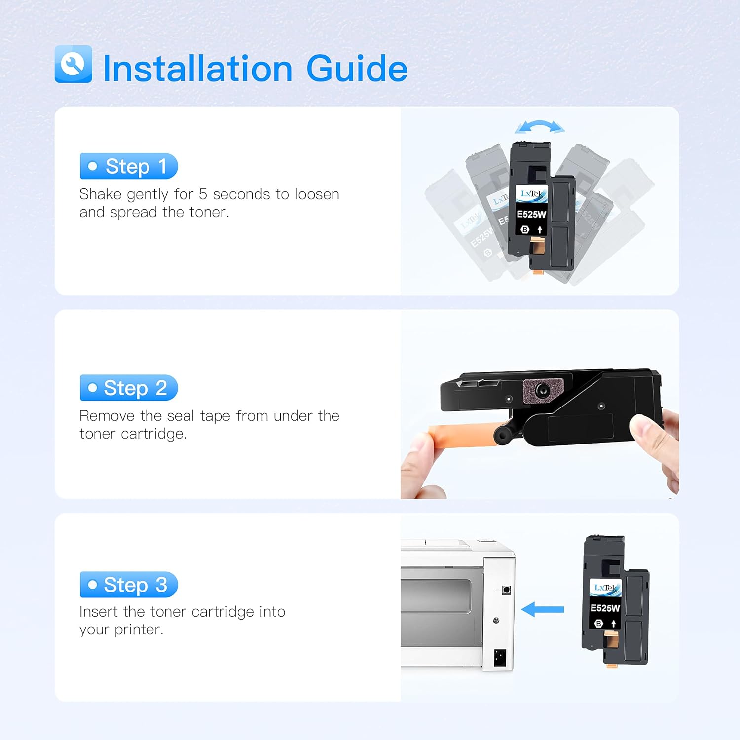 • All LxTek toner cartridges for Dell E525W are strictly tested with industry quality control process to ensure a no leakage using experience before delivery, remanufactured with ISO9001 & ISO14001 certified