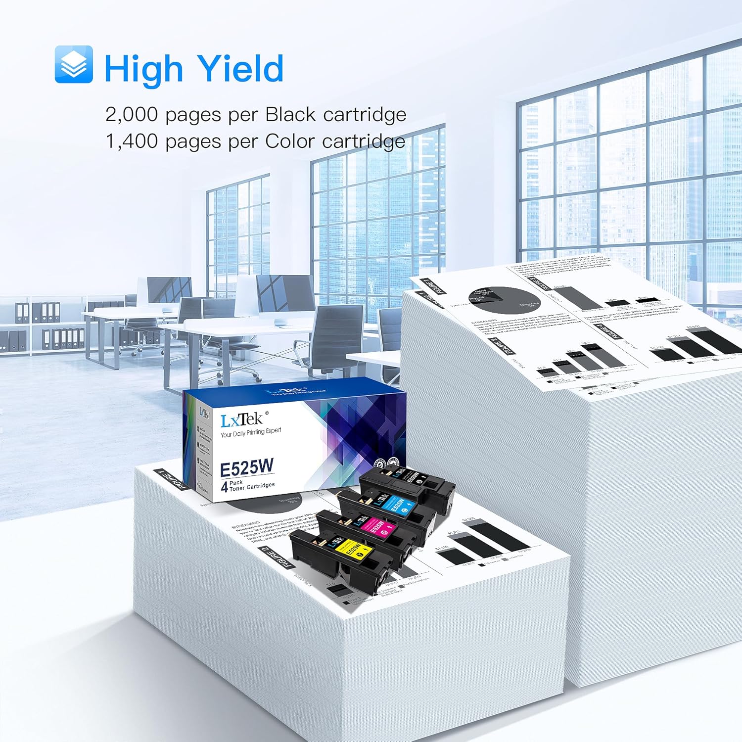 • Package Contents: 4 Pack (1 Black |1 Cyan |1 Magenta |1 Yellow) compatible for E525W toner cartridges
