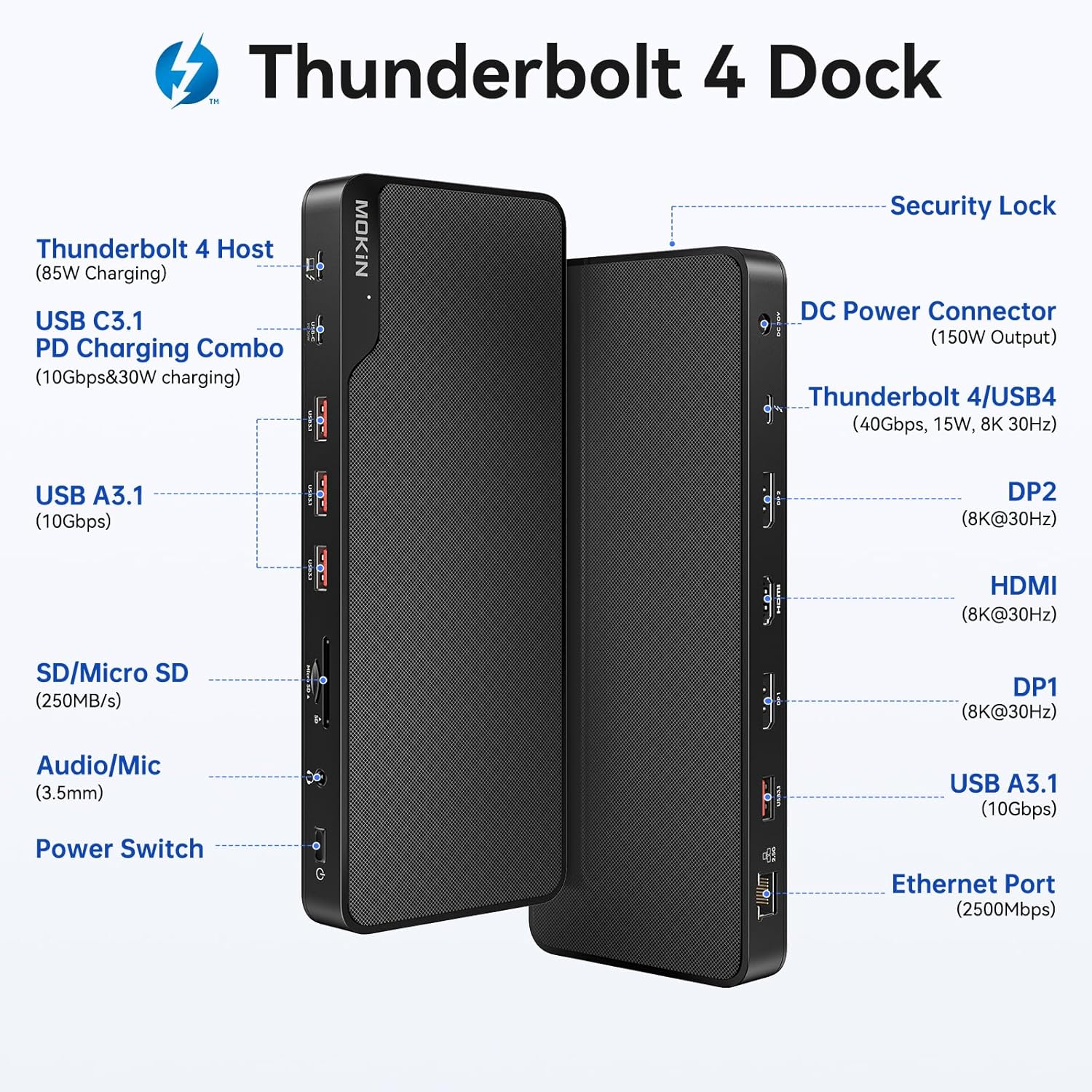 • 「What You Get」1* Mokin Thuderbolt4 USB C Docking Station, Thunderbolt4 Cable, 150W DC adapter, User Guide, and friendly customer service.