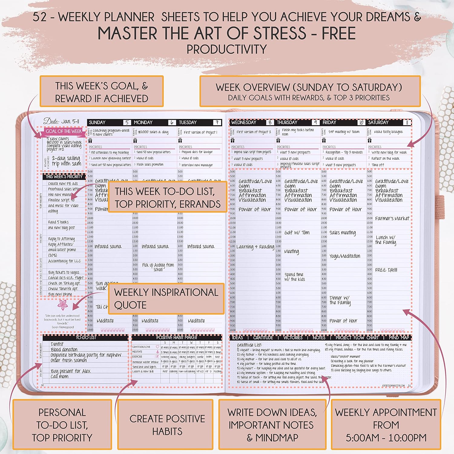 • ACHIEVE YOUR GOALS USING THE LAW OF ATTRACTION - Learn how to set big goals, be happy and manage your time well, and follow the same methods millionaires around the world use to set goals and achieve them. This monthly planner undated planner, life planner, hourly planner, yearly planner, work planner, schedule planner or appointment book. It's a perfect planner for women and men.