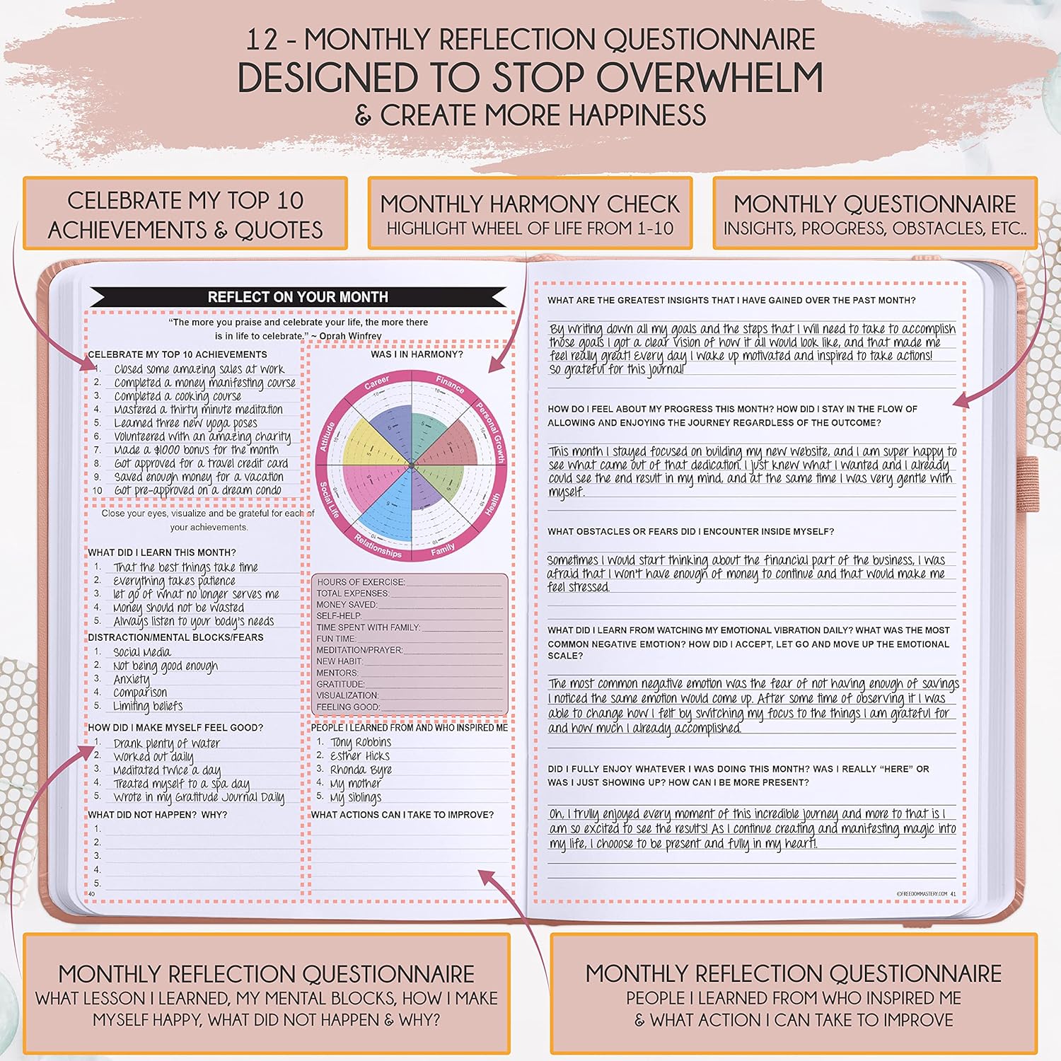 • INCREASE PRODUCTIVITY AND HAPPINESS - This is a deluxe life goal planner showing you how to become the best possible version of yourself on a mental, physical & interpersonal level using the law of attraction vibration guide. This planner is a daily planner, monthly planner, weekly planner, productivity planner, goal planner, business planner, to do list planner, planner notebook & gratitude journal all-in-one.