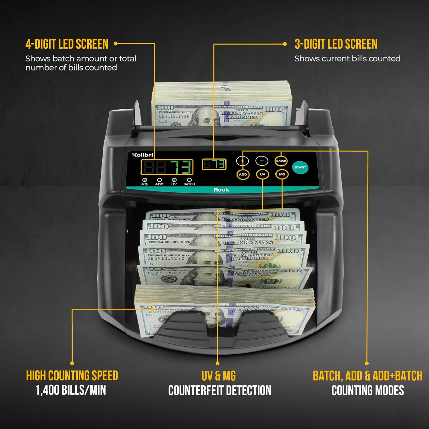 KOLIBRI Rook Money Counter with UV/MG/IR Counterfeit Detection – Count, Add & Batch Modes, 1,400 Notes per Minute Fast Bill Counter - US Dollar Cash Counter with Dual LED Display (1-Year USA Warranty)