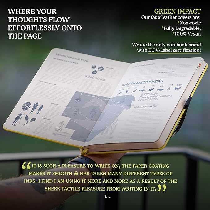 • A5 NOTEBOOK WITH LOTS O' FEATURES: Dingbats notebooks ooze quality - this hardcover bound leather notebook is crafted with PU vegan leather, micro-perforated cream 100gsm pages, an elastic closure and pen holder. It's complete with a silhouette of the Yasuni, an infographic spread about the endangered region in the endsheets and an inner pocket for a little added detail - the perfect gifts for men and women, these travel essentials are a gift that keep on giving