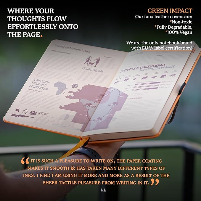 • A5 NOTEBOOK WITH LOTS O' FEATURES: Dingbats notebooks ooze quality - this hardcover bound leather notebook is crafted with PU vegan leather, micro-perforated cream 100gsm pages, an elastic closure and pen holder. It's complete with a silhouette of the Safari, an infographic spread about the endangered region in the endsheets and an inner pocket for a little added detail - the perfect gifts for men and women, these travel essentials are a gift that keep on giving