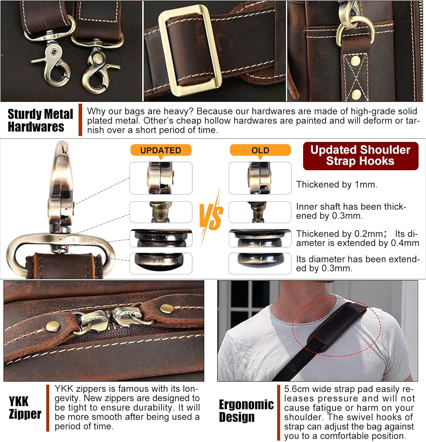 • 【Special Feature】The leather laptop briefcase can hold 2 computers at the same time. 1 removable sleeve for 17.3" laptop and 1 fasten sleeve for 16.5" to 17” laptop. The laptop bag has been updated to ykk metal zippers, which can bear 1000 times pull strength testing, to ensure quality and reliability. Shoulder straps hooks are upgraded to ensure durability.