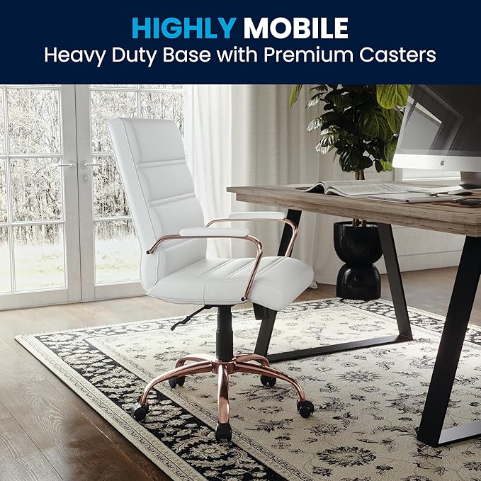 • UPGRADE YOUR WORKSPACE: Boasts a soft mid-back white LeatherSoft back and seat paired with a rose gold metal base and armrests all highlighted by an attractive horizontal line stitching to boost your desk or work area with modern style