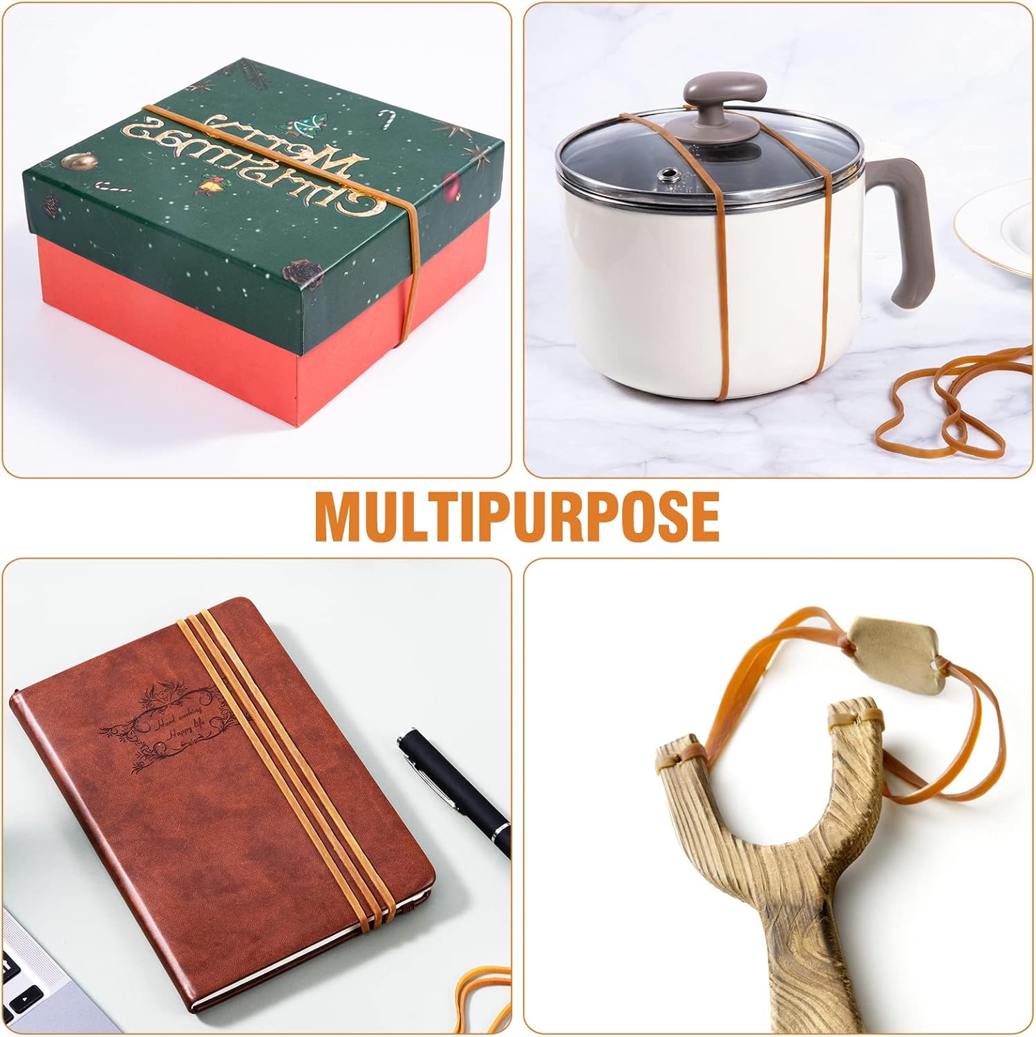 • Wide Application: This set of elastic wrapping bands can not only be used to hold the garbage bag firmly on the trash can (Circumference less than 35in), but also can be used to pack documents, books, notebooks and cartons, or to tie up lunch boxes and tools. These rubber bands can be used in a variety of places such as homes, offices, warehouses, outdoors, and more. Use your imagination, they can make your life more convenient.
