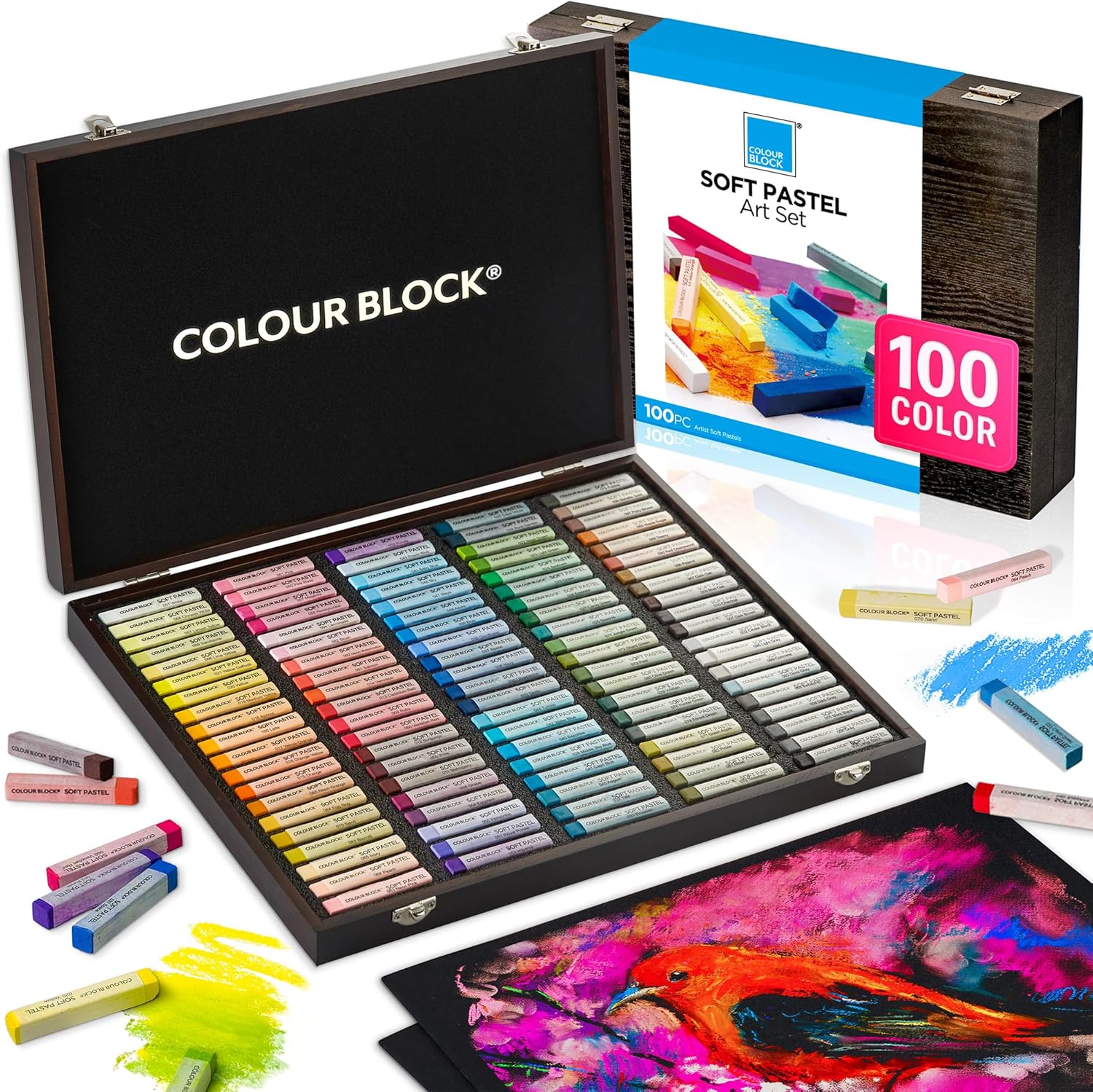 COLOUR BLOCK Soft Pastels for Artists - 100 Colors Square Chalk Pastels Set in Wooden Box - Vibrant Pigments Art Kit for Painting, Drawing, Sketching, Hobbyists, Students and Kids.