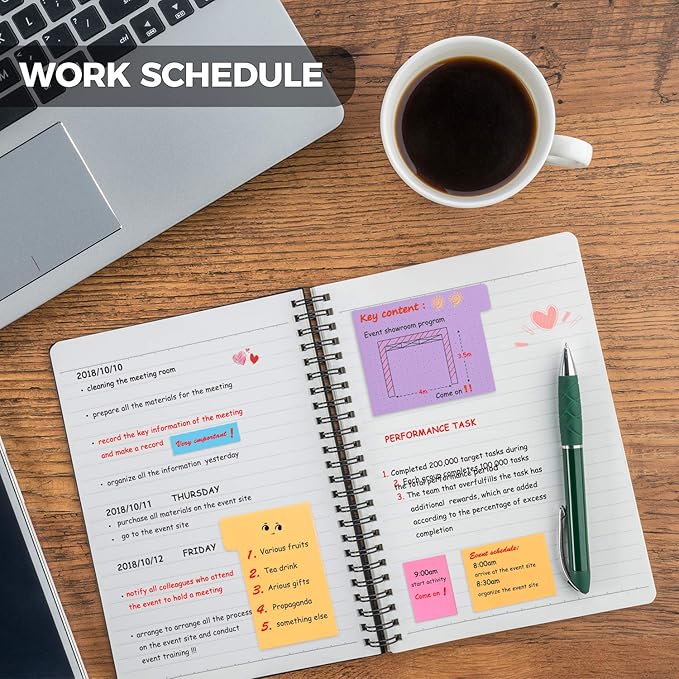 • Get Everything Organized - From color coding your documents to bookmarking important pages, these sticky notes will get you organized. The paper of notepad is sturdy, ink does not bleed through, portable and super handy to set goals. Removable adhesive for easy re-positioning, you can take them off without ripping the paper.