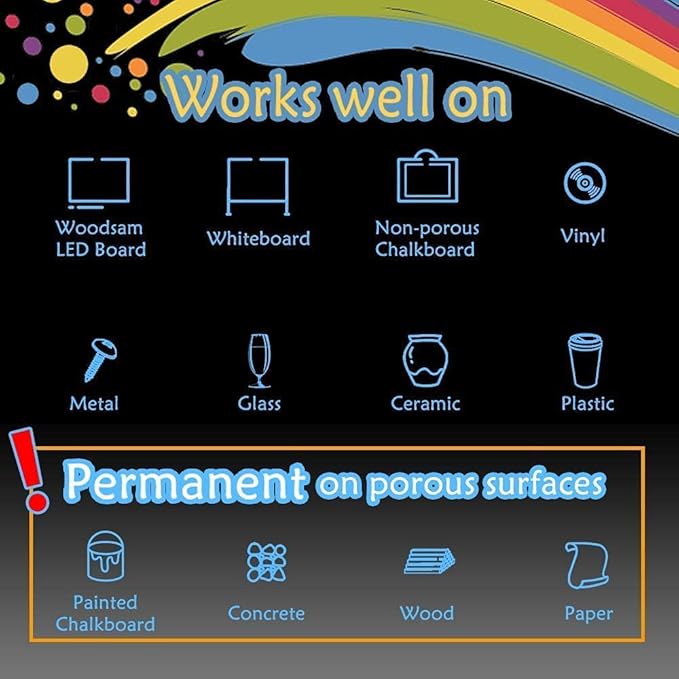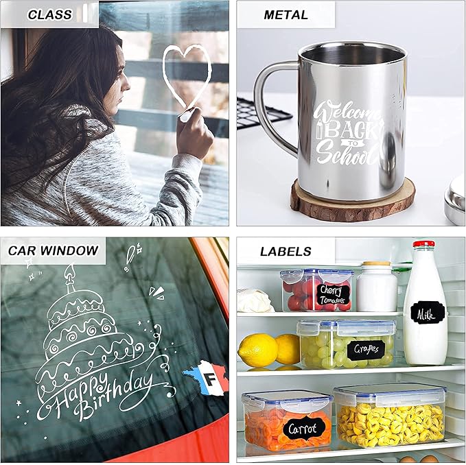 • Works on Multiple Surfaces: Our chalk markers write smoothly on most non-porous surfaces including metal, chalkboard labels, LED boards, plastic, glass, mirrors & slate. Perfect for kitchen canister labels, stencils, scrapbooking, restaurant menu, and retail advertising displays.