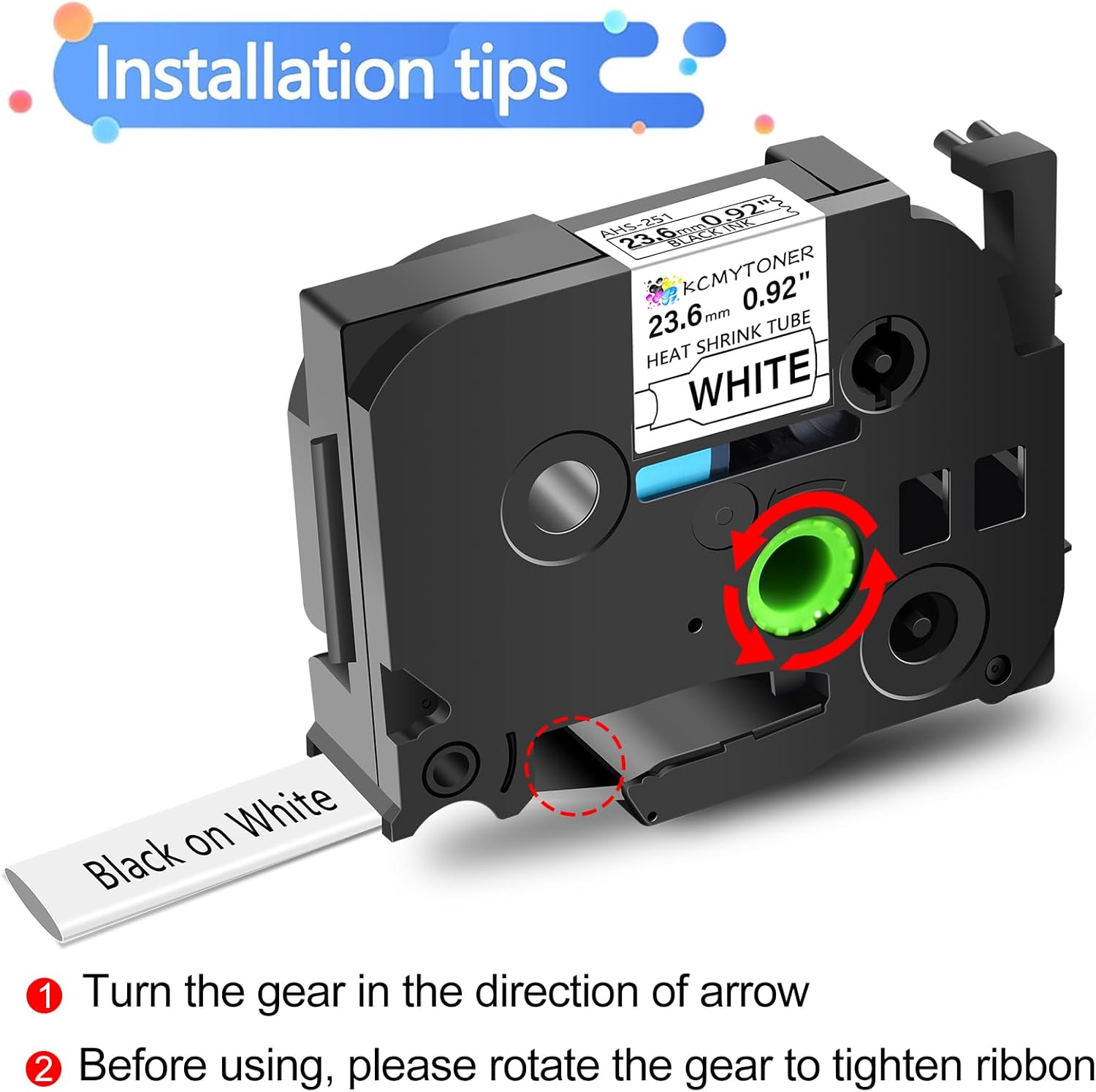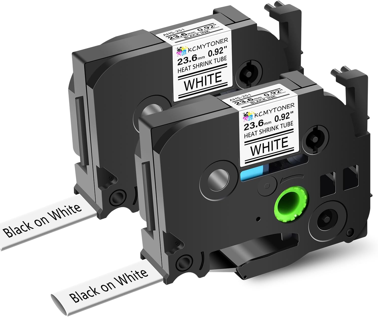 • Package Included: 2 pack KCMYTONER compatible for ptouch HSe-251 HS-251 HSe251 HS251 heat shrink tube label tapes; color: black text on white tape; size: 1 inch (23.6mm, flattened width) x 4.92 feet (1.5m).The size indication for this heat-shrink tube label is the width of the flattened tube as a label in a label printer. Do be aware that the size given relates to the label making machine, not the wire. HSe-251 23.6mm tube suits cables ranging from Φ7.3mm to Φ14.3mm in diameter.