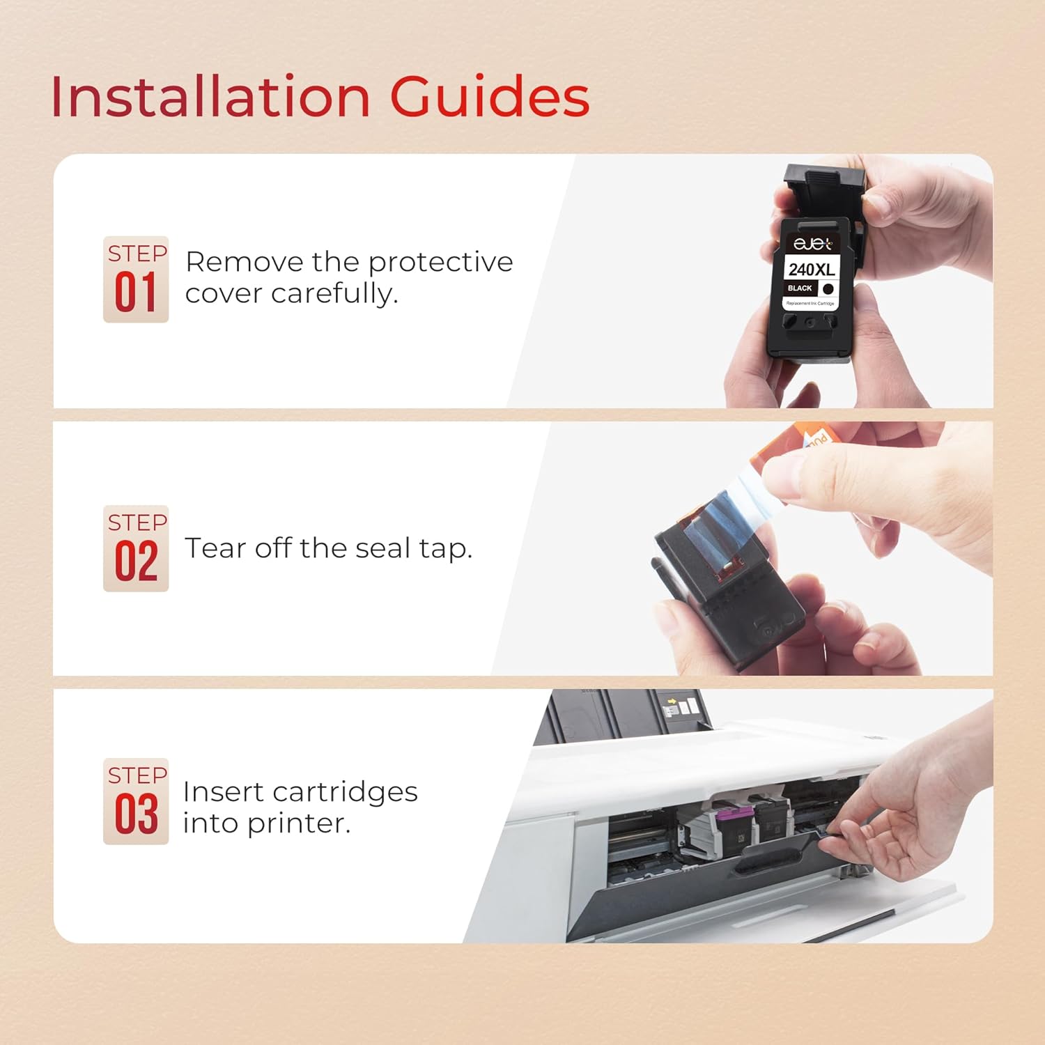 • 【240XL and 241XL Ink cartridge Equip with Latest Chips】 ejet 240XL and 241XL Ink cartridge high yield equipped with upgraded smart chips ensure each ink cartridge will be 100% recognized by compatible printers quickly and display accurate ink level, you can enjoy worry-free and efficient printing