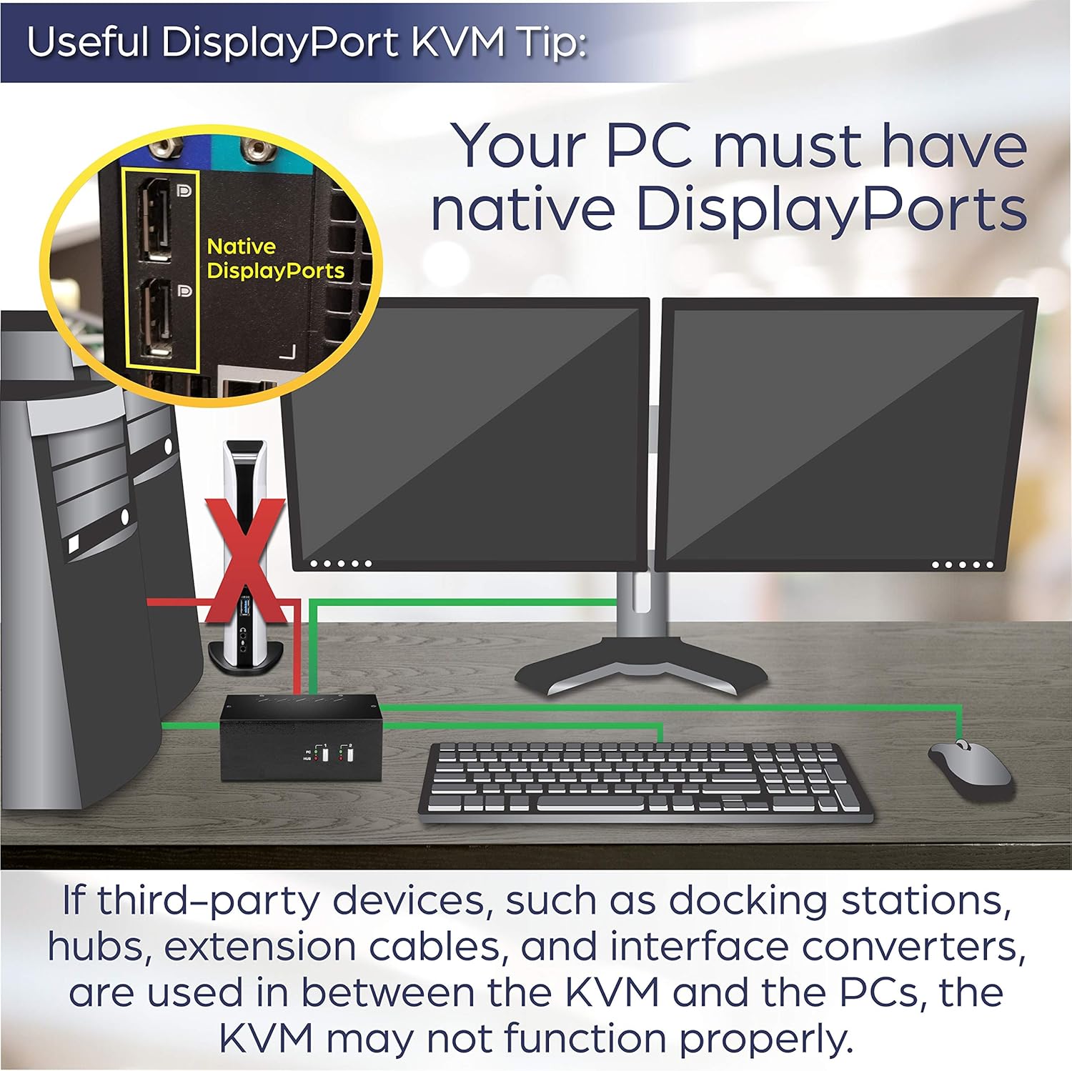 • CONTROL TWO COMPUTERS: This 2-port Dual monitor DisplayPort KVM 1. 2 KVM switch allows you to control two computers with one set of console controls and is designed for use with Dual DisplayPort systems. The KVM switch is designed to connect two DisplayPort monitors. [Recommended for use with DisplayPort monitors and graphic cards with DisplayPort]