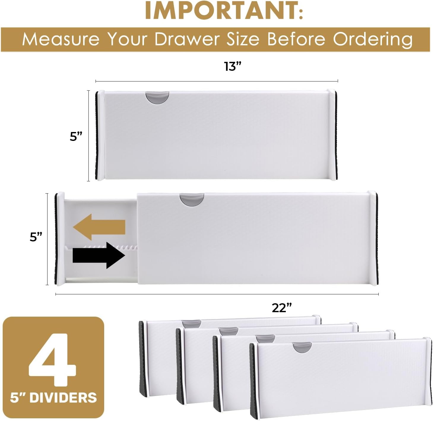 RAPTUROUS Adjustable Deep Drawer Divider – 5" Tall, Expandable 13-22", 4-Pack, Non-Slip Drawer Dividers for Clothes, Dresser, Kitchen & Office Organization (White)