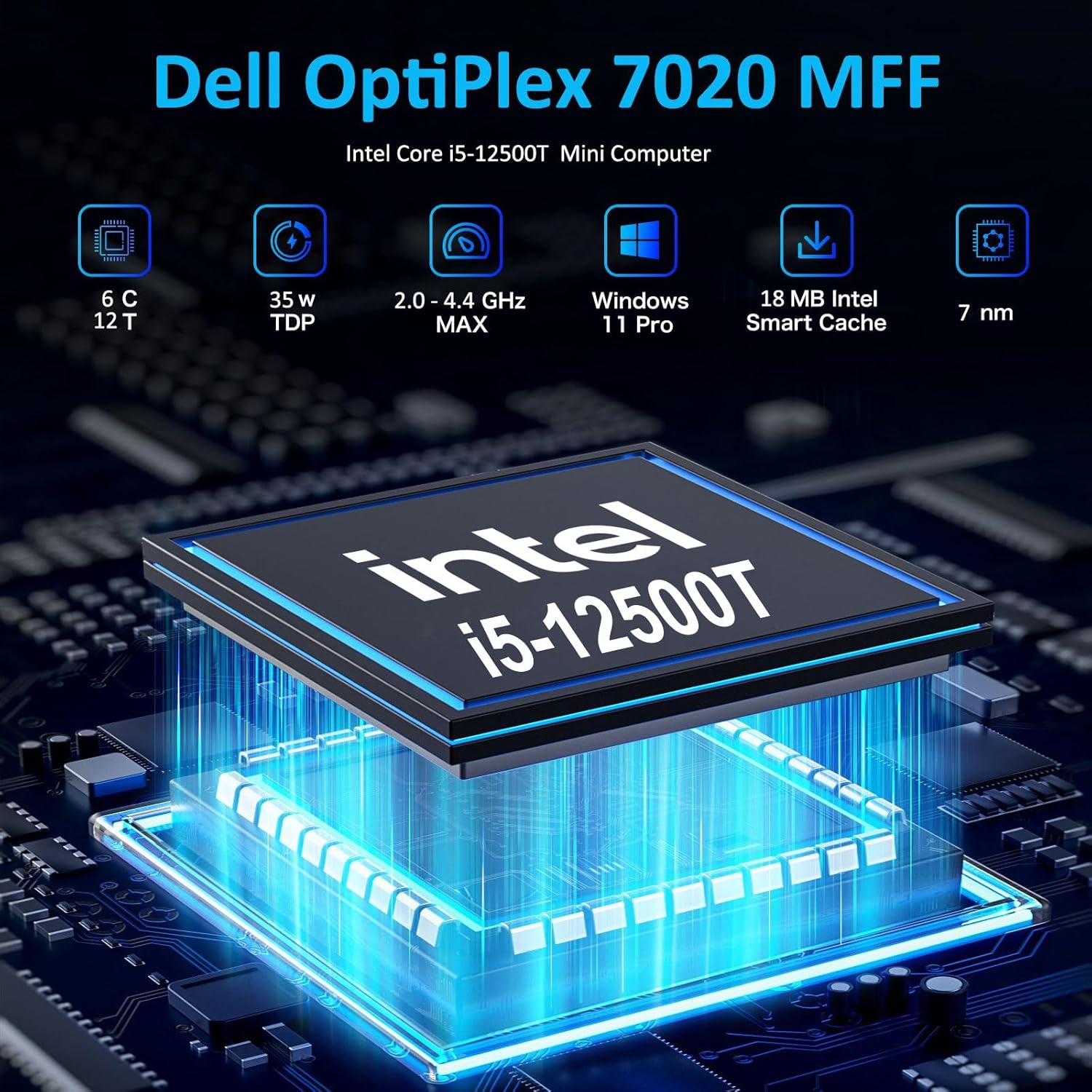 • With its compact design, the Dell OptiPlex 7020 Mini Desktop Computer can fit into tight workspaces, brought on location, and carried on commutes. Despite its small size, this enterprise-class computer can take on demanding workloads with its 12th Gen Intel Core i5-12500T (18 MB cache, 6 cores, 12 threads, 2.00 GHz to 4.40 GHz Turbo).