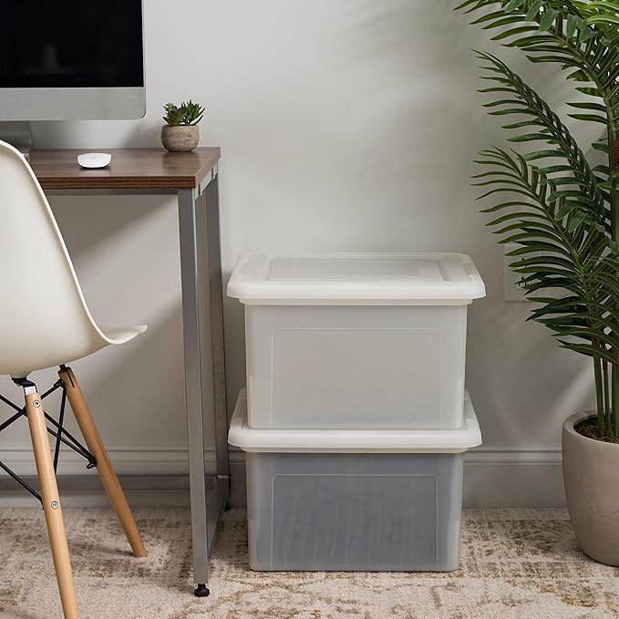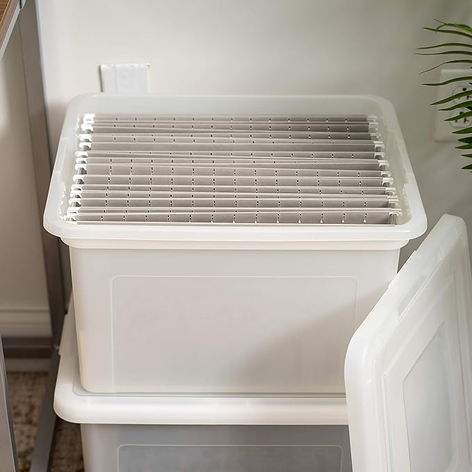 IRIS USA File Box, Plastic File Organizer with Lids for Letter/Legal File, Portable Document Box For Moving, Storage Bin with Durable and Secure Lid, Stackable Nestable BPA-Free, Pearl 35 Qt. 4 Pack