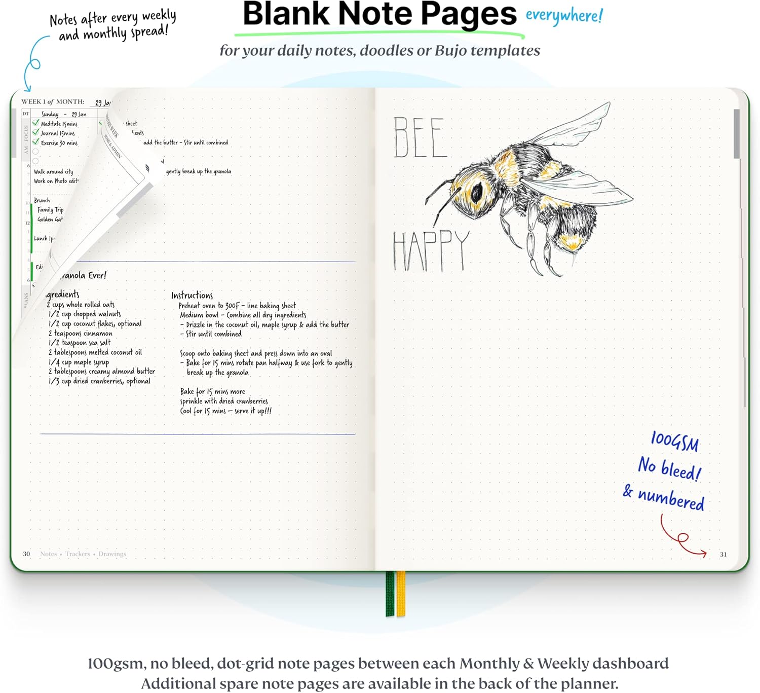 • Planner + Notebook All in 1: Annual Calendar, Notes Index, Monthly & Weekly to do list planner dashboards, 93 numbered dotted note pages for expanded task lists, notes, or sketches. All-in-one business planner, notebook and life organizer.