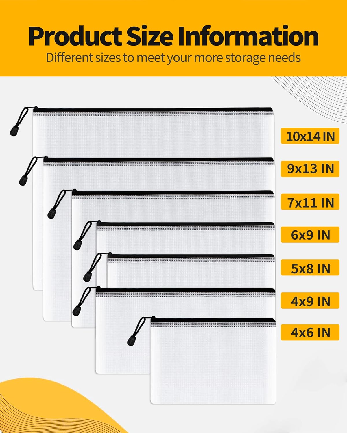 • PACKAGE CONTAINS: You will get a set of 21 Packs of Multi-size plastic zipper pouches, (10x14 inches)*3, (9x13 inches)*3, (7x11 inches)*3, (6x9 inches)*3, (5x8 inches)*3, (4x9 inches)*3, (4x6 inches)*3. It can help you organize your miscellaneous items to meet your daily life and work. Manufacturer recommended age 3 years and up