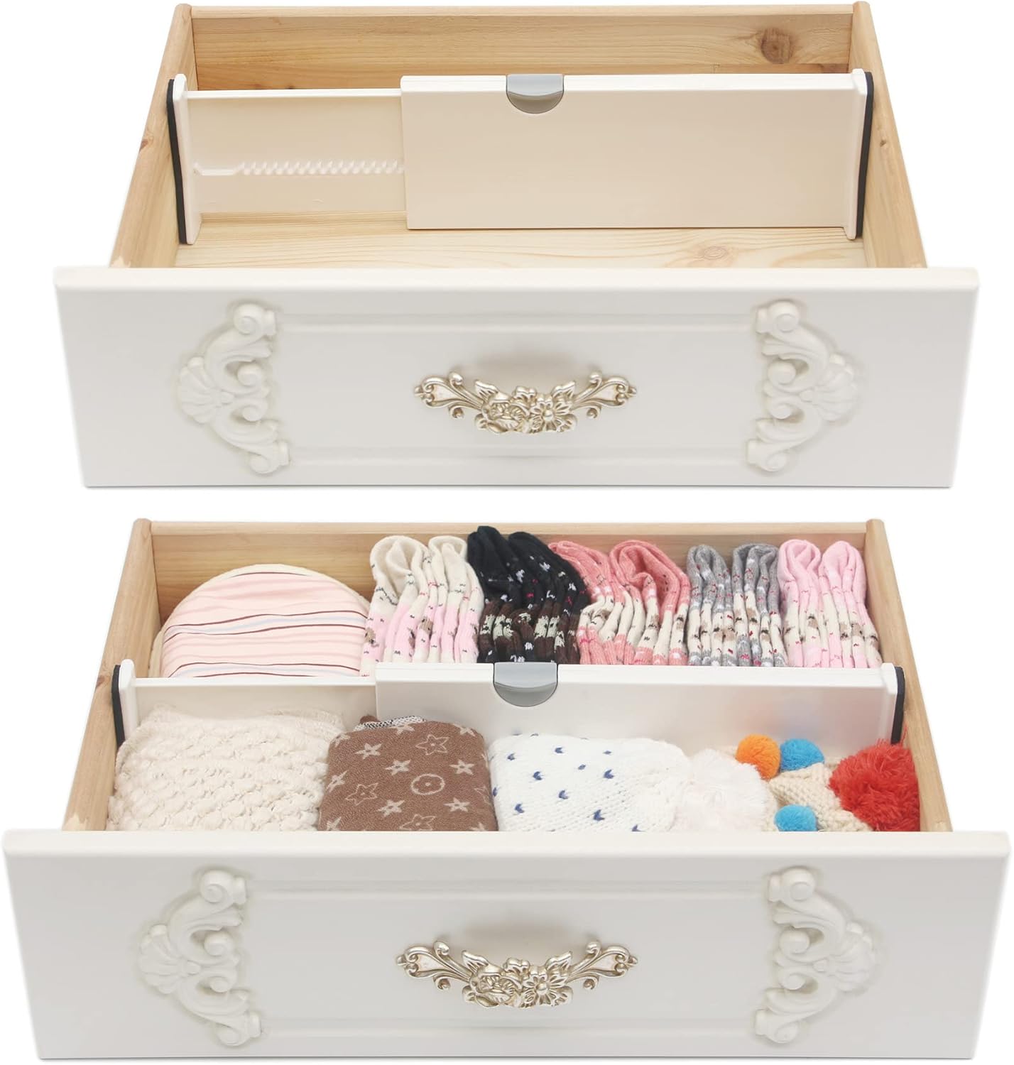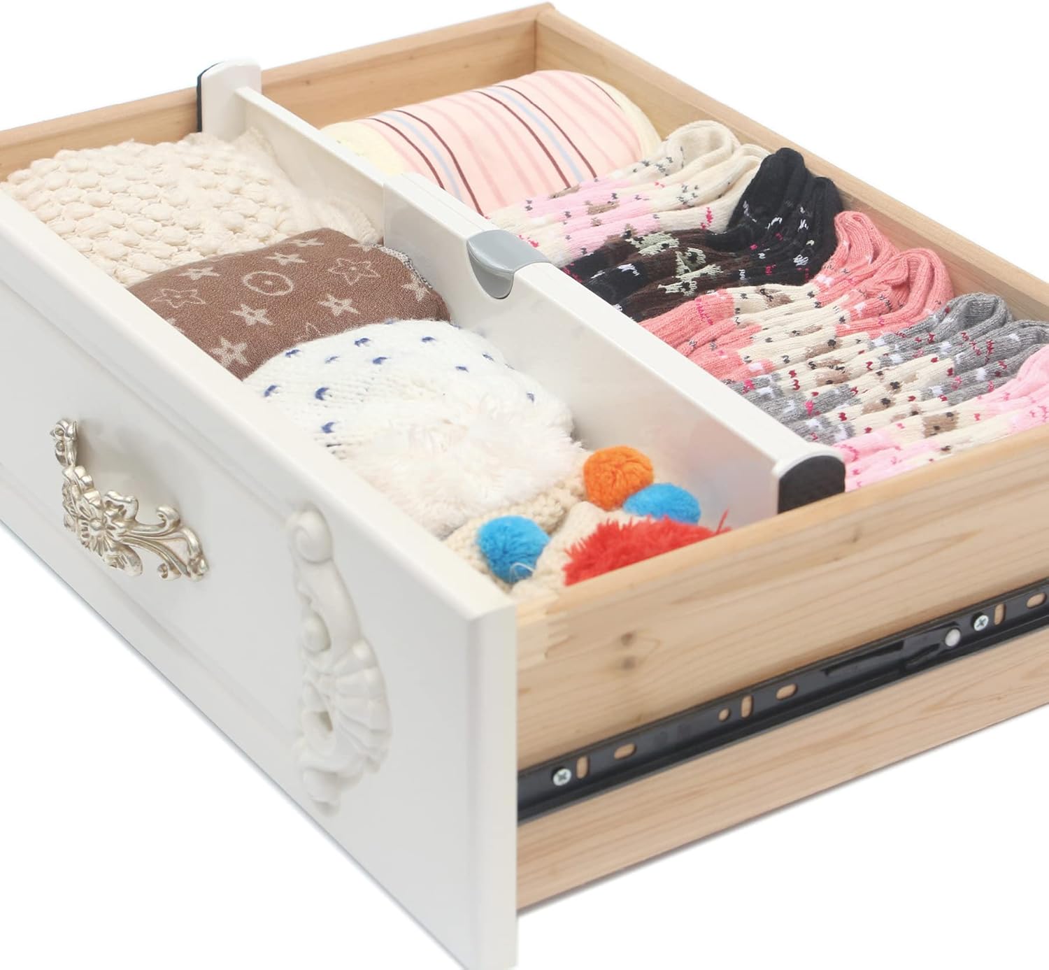 • Also can be used for drawer organizer, cabinet dividers partitions, desk drawer dividers, drawer separators, clothes, clothing, underwear, sock. Store and organize socks, women's leggings, sports bras, yoga pants, lingerie, tights, t-shirts, scarves, belts, accessories and more; The dividers expand to desired length and lock into place to keep everything situated; Customize your drawers to perfectly fit your storage needs.
